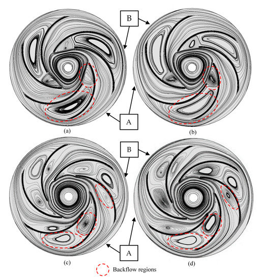 The internal flow patterns were predicted by CFD simulation. Figure 8 indicates the streamlines in the impellers with different leading-edge shape on the spanwise 50% plane. As in the situation in the initial impeller, the alternating stall patterns were observed in the blunt, sharp, ellipse, and round impellers. As indicated by “A”, there were three well-behaved passages in each impeller. As indicated by “B”, three stalled passages also existed in each impeller. The A and B passages distributed alternately. The backflow regions in the blade passages, which are indicated by red-dash circles, had relative fixed cites during impeller rotation.