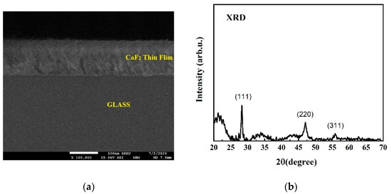 (a) Cross sectional FE-SEM image of CaF2 thin film; (b) XRD pattern for the CaF2 film.