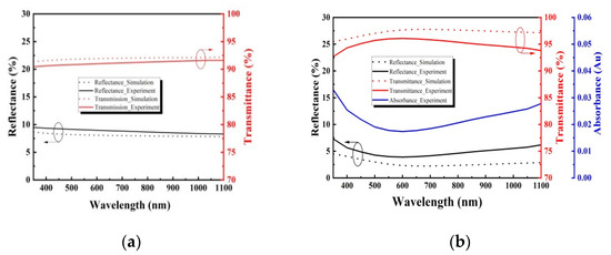 Comparison of the simulated and experimentally obtained optical spectra of: (a) the uncoated and (b) the CaF2-coated borosilicate glass (BSG).