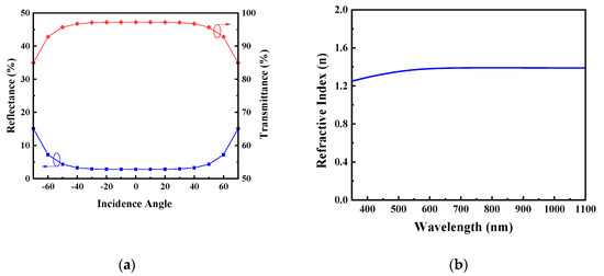 (a) Influence of the different incident angles on the reflectance and transmittance; (b) refractive index.