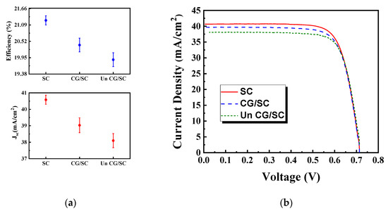 (a) Statistical analysis of Jsc and η on the SC, CG/SC and the Un CG/SC. The graph shows the data from five different cells, which were analyzed with standard deviation values; (b) the J–V characteristics of a SC, CG/SC and Un CG/SC.