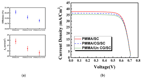(a) Statistical analysis of Jsc and η on the PMMA/SC, PMMA/CG/SC and PMMA/Un CG/SC. The graph shows the data from five different SCs, which were analyzed with standard deviation values; (b) the J–V characteristics of a PMMA/SC, PMMA/CG/SC and PMMA/Un CG/SC.