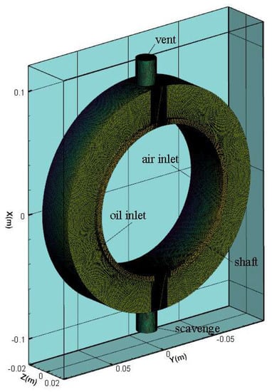 The geometric structure of the bearing chamber is shown in Figure 1. The structural parameters and values of the bearing chamber involved in the analysis mainly include the rotor radius of the bearing, rs = 60 mm; the height of the bearing chamber, hb = 30 mm; the width of the bearing chamber, wb = 30 mm; and the diameter of oil scavenge ds (scavenge is shown in Figure 2) and the air vent dv are both 16 mm. Seal air flows into the bearing chamber from air inlet and discharges through vent. The gap of oil inlet is 2 mm. Moreover, the lubricating oil is shed into the bearing chamber from the clearance between the bearing outer ring and the cage (oil inlet in Figure 1) and discharges through scavenge. The equivalent size of oil inlet is 4 mm (oil inlet in Figure 2).