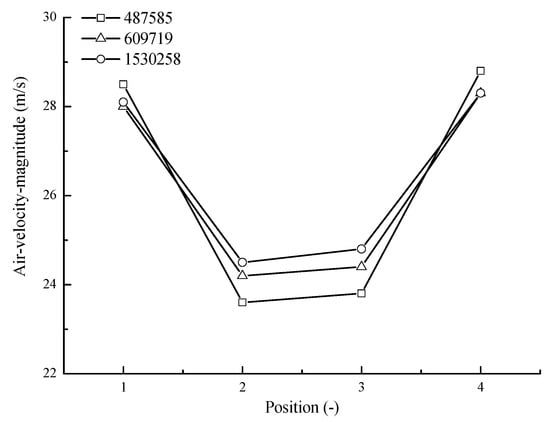 Verification of grid independence, the number of meshes is 487,585, 609,719, and 1,530,258, respectively, when air inflow is 12 g/s, the air phase velocities at four positions (−0.11,0,0), (−0.09,0,0), (0.09,0,0), and (0.11,0,0) in z = 0 plane.