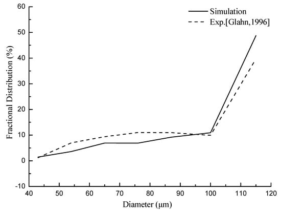 In order to verify the correctness of the calculation method, the result in this paper is compared with the relevant test in literature [16]. In the literature, the Phase Doppler Particle Analyzer (PDPA) is used to sample 3000 oil droplet diameters in the aero-engine bearing chamber, and the histogram of oil diameter distribution is obtained. The distribution of droplet diameter is in a range of 14 to 120 μm. The operating condition in literature is air inflow mg = 10 g/s and oil inflow VL = 100 L/h. The oil droplet diameter distribution is calculated under these conditions. It should be noted here that in the calculation, the oil droplets larger than 120 μm in diameter are not considered, so only the oil droplet diameter distribution in a range of 10 to 120 μm is calculated. The calculation results are compared with the results in the literature in Figure 4. Through comparison, the calculation results are consistent with the experimental results in the literature, which verifies the rationality of the research method in this paper. The calculation results given in this paper can provide more accurate initial conditions for the analysis of the flow and heat transfer, and also can provide reference for the further test of oil mist concentration in the bearing chamber.
