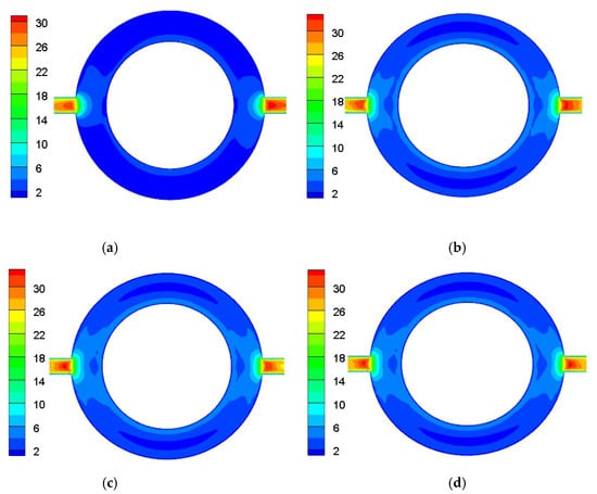 The velocity (m/s) distribution of air at different time when the air inflow is 12 g/s, oil inflow is 15 g/s, and the initial oil droplet diameter is 28 μm at z = 0 plane (the far left is vent; the far right is scavenge). (a) t = 50 ms; (b) t = 100 ms; (c) t = 200 ms; (d) t = 400 ms.