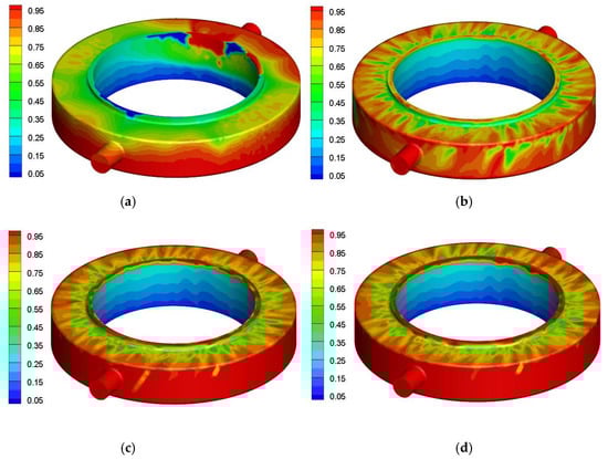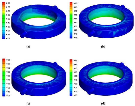 Figure 6 and Figure 7 show the volume fraction of oil diameter in the range of 56 to 80 μm and 28 to 40 μm when the air inflow is 12 g/s, oil inflow is 15 g/s, and initial oil droplet diameter is 28 μm, respectively. In Figure 6, the volume fraction of the large diameter oil droplet on the outer wall surface of the bearing chamber is large, that near the inlet is relatively low, and gradually increases along the z axial direction. The volume fraction of large diameter oil droplet near the outer wall of the bearing chamber increases gradually with the passage of time. The reason is that the oil droplet flow with the air phase, and enter the bearing chamber from inlet. During the flow process, the oil droplets with smaller diameter constantly gather. When the air phase flow field reaches the wall that is opposite to the inlet, the flow direction of air phase changes and flows along the wall. During the movement of the oil droplet with the air phase flow field, the oil droplets constantly gather again. Therefore, the volume fraction of oil droplets at the external wall surface of the bearing chamber is large. It can also be seen from the figure that when the oil droplet with larger diameter runs to the entrance with larger velocity, the breakup will occur. The oil droplets are coalesced and broken in the bearing chamber, and finally reach a steady state. In Figure 7, the small diameter oil droplet is mainly distributed near the inlet, and this distribution gradually decreases along the axial direction. It can be seen that the size of the oil droplet in the bearing chamber is different because of the coalescence of oil droplets. The small diameter oil droplet is mainly concentrated near the inlet, while the large diameter oil droplet is mainly concentrated on the outer wall of the bearing chamber.