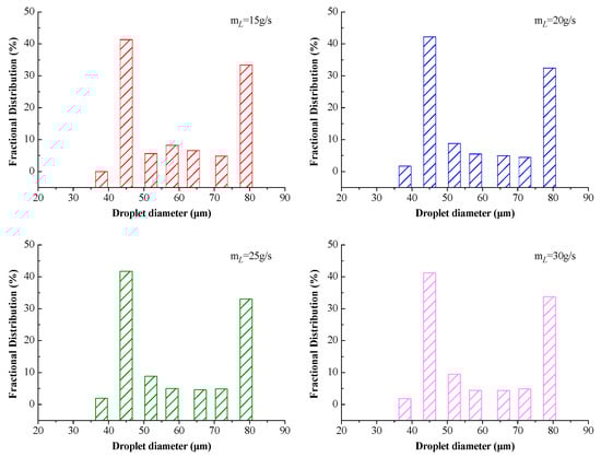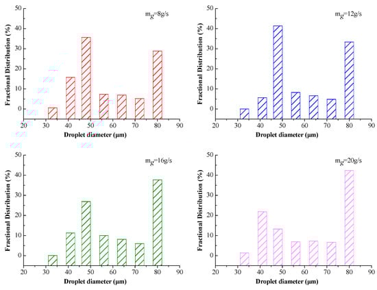 The change of oil droplet size distribution under different air inflow is shown in Figure 10; when the oil inflow is 15 g/s, the initial oil droplet diameter is 28 μm at t = 250 ms. It can be seen that the peak value of oil droplet diameter is mainly concentrated around 50–80 μm. When the air flow is small, the proportion of oil droplet with 50 μm is larger than that with diameter of 80 μm. With air inflow increasing, the effect of turbulence intensity increases, and the strong disturbance in the flow field and the entrainment of vortices enhance the mutual collision between oil droplets. After the oil droplets collide with each other, the proportion of large diameter oil droplets increases in the oil droplet group due to the adhesion. Meanwhile, the increase of air inflow leads to the increase of oil droplet velocity, which promotes the coalescence between oil droplets. The smaller diameter oil droplet coalesces into larger diameter oil droplets. When the air inflow is 20 g/s, the peak value of oil droplet diameter distribution is mainly around 80 μm. This shows that the air inflow has a significant effect on the oil droplet diameter distribution.