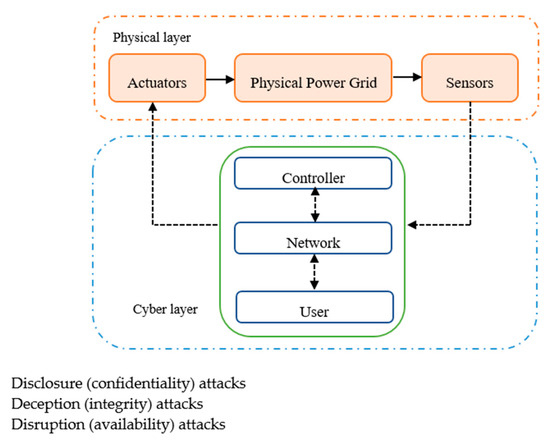 Despite the fact that cyber intrusions on cyber-physical systems (CPSs) can be found under different terms, such as bias injection attack, zero dynamics attack, denial of service (DoS) attacks, eavesdropping attack, replay attack, stealthy attack, covert attack, and dynamic false data injection attacks [18]. These attacks can still be classified according to the one or multiple security criteria they are jeopardizing, as set forth in Figure 2.