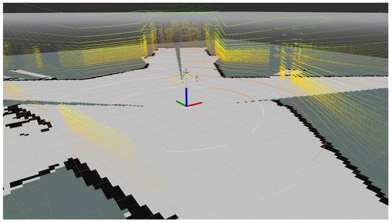 The main disadvantage of global maps is that they are static. Therefore, although they are used for global route planning, they do not contemplate dynamic obstacles, such as other vehicles or pedestrians, which makes them insufficient for autonomous navigation. In order to compensate for this absence of information, local maps are included in the system. Local maps are generated online and only cover the nearest surroundings of the vehicle, integrating the latest readings from the sensors. In the presented platform, the information from the three LiDAR sensors is processed in real time using the approach presented in [11]. This method generates an occupancy grid map (OGM), which is used later on by the planning and navigation modules in order to handle the existing obstacles around the vehicle. An example of the LiDAR point cloud and the local map output is presented in Figure 4.