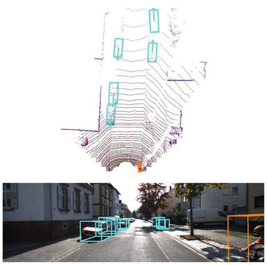 - Obstacle detection and classification: First, an autonomous vehicle must be able to identify other road agents; i.e., vehicles, pedestrians, cyclists, etc. This difficult task can be performed using different techniques; however, the trend in recent years has been to use deep learning methods to detect and classify the different obstacles around the vehicle. For example, in the presented platform, two different methods are integrated: the first method [12] performs an analysis of the images taken from the monocular camera—this algorithm can reason simultaneously about the location of objects in the image and their orientations on the ground plane—while the second method [13,14] exploits the available 3D information from the LiDAR sensor to also detect and classify the road agents, this time providing 3D detections, as shown in Figure 5. Both methods are able to run in less than 100 ms, thus providing this critical output in real time.
