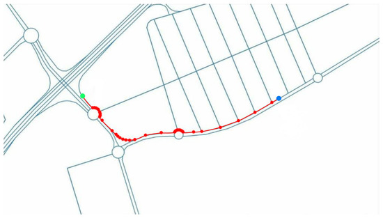 - Global planning considers all the fixed obstacles, such as the features of the roads (number of lanes, width, connections between different roads, etc.), to find the shortest path between the vehicle’s current position and the goal destination.This task is done automatically by obtaining all necessary information from OpenStreetMaps (OSM) and generating the shortest path using Dijkstra’s algorithm. The global route also includes information about the maximum speed for each road or the lane in which the vehicle should be [10]. Figure 7 shows a global path (red line) between the current position (blue dot) and the goal destination (green dot), including all the OSM nodes (red dots).