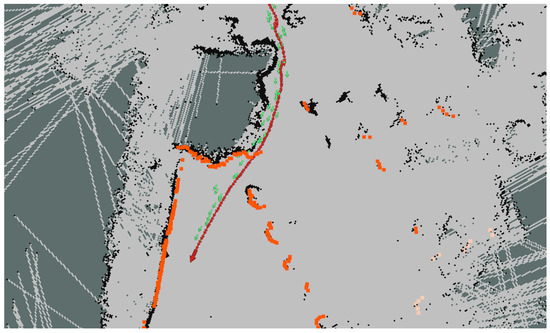In [8], a method which includes GNSS information in the AMCL algorithm is proposed, which allows the improvement of the distribution of particles in the filter thanks to the GNSS measurements. Furthermore, this method also uses the local odometry generated from the LiDAR sensor to accurately propagate the particles. Figure 9 shows how the LiDAR point cloud (orange) and the map feature (black) matching improves the GNSS localization (green arrows) and makes it converge into a more accurate localization (red arrows).