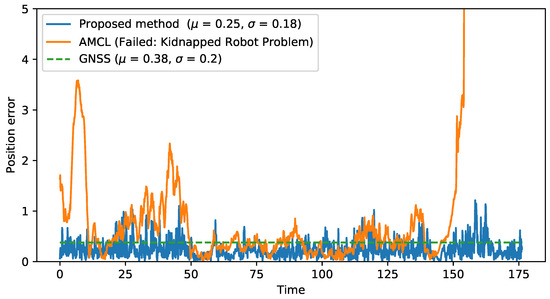 Figure 10 compares the proposed method with the localization sources that it combines (GNSS and original AMCL), plotting the error along a recorded sequence. The method that combines LiDAR and GNSS information results in a more stable localization, avoiding peaks on localization error or the kidnapped robot problem shown at the end of the sequence by AMCL algorithm, while improving GNSS accuracy (0.25 m of mean error compared to 0.38 m for GNSS localization) due to the use of the LiDAR and map information.