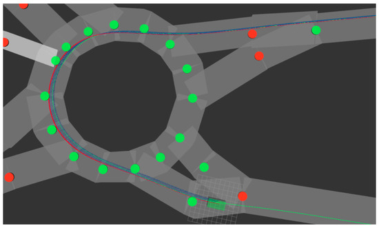 The complete platform’s software architecture described above, except for the communication module, is replicated inside CARLA using ROS as a bridge, which acts as an interface. As the proposed platform’s sensor information is presented in a standardized ROS message format, it is possible to substitute the sensor drivers with the artificial sensor data generated by the simulator, consequently allowing the digital twin to perceive the simulated environments as if they were real. Consequently, the cameras, LiDARs, the GNSS and the IMU have been mimicked inside the simulator using their datasheets and CARLA’s parametrization feature to achieve the maximum correlation between reality and simulation. Once added, their simulated readings are automatically published through ROS, making them readable by all the platform’s software architecture modules. Likewise, the control commands output by the Stanley controller can be directly interfaced with the simulated car through ROS, closing the information loop and transferring the proposed architecture to the simulated environment. In consequence, it is possible to extract information from the digital environment with the several simulated sensors and to drive and act upon the simulated car within the real proposed software architecture.