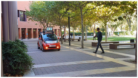 Although most of the research on autonomous vehicles has usually focused on navigation and perception problems, the interaction between the car and other vulnerable road users (VRUs) has recently attracted increased attention. These VRUs include pedestrians or cyclists, and the interactions between these and the vehicles are of special importance in urban areas. Previous works have tackled how pedestrians react when facing a driverless vehicle, as well as how to identify pedestrians’ intentions. For instance, in [26], a human–machine Interface (HMI) was presented. The behavior of pedestrians was analyzed, concluding that a communication system proves to be positive in the interaction between the pedestrian and the vehicle. Moreover, the behavior of pedestrians was further studied in [27], where the vehicle detected the pose of pedestrians in order to predict their intentions.