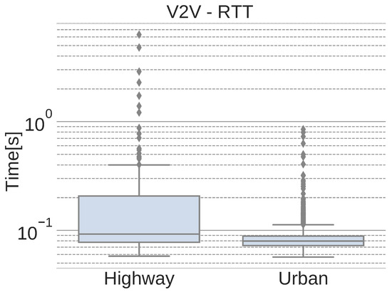 Following the original metrics used in [21], Figure 14 shows the round-trip time (RTT) of the network packets that are exchanged between vehicles in each scenario.