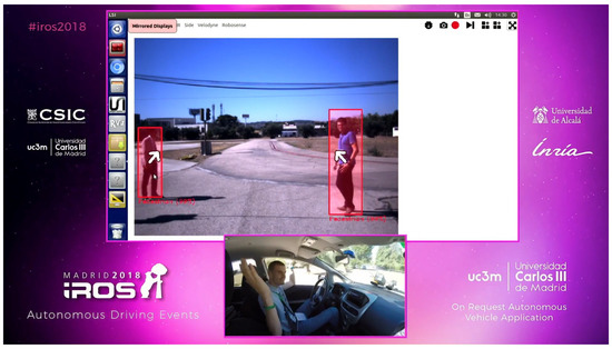 Due to its great versatility, the presented vehicle is also a great platform for demonstrations and competitions. For example, the perception algorithms and the automation capabilities were showcased in a demonstration event for autonomous vehicles during the IROS 2018 conference, as shown in Figure 15.