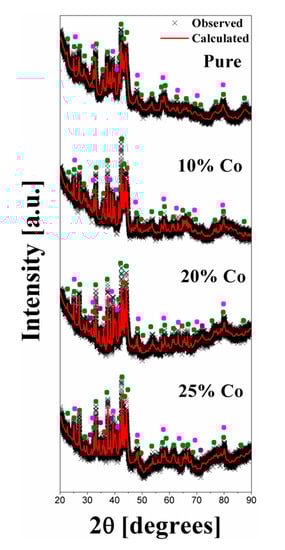 Rietveld refinement allowed us to determine the type of structures with these alloys. The parameter values for samples with a stoichiometry of Nd16Fe76−xCoxB8 with x = 0, 10, 20 and 25 are reported in Table 1. These data indicate that the crystallite size for Nd1.1Fe4B4 and Nd2Fe14B phases was in the nanometer range, from 5 to 90 nm. The crystallite size parallel to the Nd1.1Fe4B4 and Nd2Fe14B phases increases with increased concentrations of cobalt. It can be noted that the two phases of parallel crystallite sizes are greater than the perpendicular ones, indicating that the crystallite shape is not spherical but elongated in that direction. The refinement of the mean crystallite size of the hard phase is required in order to obtain higher remanence values [46,47] and to increase the ferromagnetic exchange coupling between the soft and hard grains [10]. The obtained values of the crystallite size indicate that these melted alloys are nanostructured.