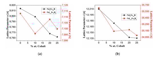 Figure 2a,b shows the behavior of the lattice parameters with respect to the cobalt concentration of the Nd2Fe14B and Nd1.1Fe4B4 phases for all samples. It is observed that, for x = 0, 10, 20 and 25, the lattice parameters a and c of Nd2Fe14B and Nd1.1Fe4B4 phases decrease considerably with the variation of the concentration of cobalt. This behavior is a consequence of the substitution of Fe by Co atoms, which has an atomic radius (1.25 Å) lower than the atomic radius of Fe (1.26 Å), causing the lattice to reduce. These parameters are consistent with those reported in the literature [48,49].