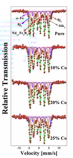 The Mössbauer spectra of Nd16Fe76−xCoxB8 (x = 0, 10, 20 and 25) samples, collected at RT, are shown in Figure 3. To fit these spectra, several subspectra were required, which were associated with the Nd2Fe14B, α-Fe and Nd1.1Fe4B4 phases. The last phase was not identified by XRD. Seven sextets were used to fit the magnetic part of the spectra, with six of them corresponding to those reported for the hard phase (16k1, 16k2, 8j1, 8j2, 4c and 4e) and the other corresponding to the α-Fe phase (sb) reported by Hernandez et al. [50,51,52]. As can be observed, the Mössbauer spectrum of the sample with x = 0 is typical of the Nd2Fe14B phase [8]. It was necessary to add a small doublet (site d) in order to obtain the best fit, and this was attributed to the paramagnetic Nd1.1Fe4B4 phase [50]. The Mössbauer parameters, such as the hyperfine magnetic field (Hhf), isomer shift (IS), quadrupole splitting (QS) and area of each subspectra, are listed in Table 2. The value of line width (Γ) takes values of 0.33 mm/s for all sextets and 0.40 mm/s for doublets, which is attributable to the degree of disorder of the samples.