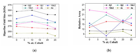 Figure 4a shows the variation of the hyperfine field, Hhf, of the different inequivalent Fe sites in the Nd2Fe14B hard magnetic phase as a function of Co content. It can be noted that the hyperfine field of the different sites has a tendency to decrease. This decrease is mainly due to the cobalt having a magnetic moment (1.71 μB/atom) lower than the magnetic moment of iron (2.22 μB/atom), and this result suggests that cobalt atoms enter within the lattice of Nd2Fe14B. However, for site 4c and 16k2 a higher rate of decrease of the hyperfine field with the cobalt concentration occurs; only for the 10% increase of cobalt does this result indicate that the cobalt atoms have a preference for substituting iron atoms at those sites. However, for 10% of cobalt, a higher rate of increase of the hyperfine field can occur because, in these sites, there is a higher presence of Fe neighbors than in the other sites for the different concentrations of doping with cobalt. These results agree with those of Liao et al. [52].