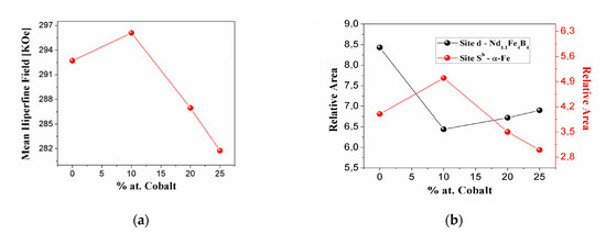 It can be observed in Figure 5a that there is a general tendency of the mean hyperfine field (MHF) to decrease as the cobalt content increases. Here, Figure 5a shows a peak at around 10% of doping with cobalt, which corresponds to Figure 4a, where an increase in the sites of hyperfine fields is evidenced due to the high presence of Fe atoms as first neighbors. Figure 5b shows the behavior of the relative area of site d (Nd1.1Fe4B4) and site sb (α-Fe) relative to Co content. The diminishing relative area of ^site d (Nd1.1Fe4B4) suggests that substituting iron atoms by cobalt atoms destabilizes the Nd1.1Fe4B4 phase. Besides, this Figure 5b shows that the relative area of the α-Fe phase decreases with the cobalt content. Only about 10% of cobalt increases the α-Fe phase, which is consistent with the previous results shown in Figure 4a and Figure 5a. These results indicate that cobalt atoms diffuse into the structure of Nd2Fe14B, substituting and expelling iron atoms and producing segregated Fe.