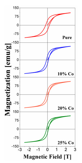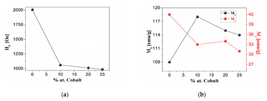 Figure 7b shows the behavior of the saturation magnetization Ms and of the remanent magnetization Mr with the concentration of cobalt. It can be concluded that increasing the concentration of cobalt increases the saturation magnetization and decreases the remanent magnetization. This behavior can be explained by the faxt that cobalt has a lower magnetic moment than iron and also stimulates the creation of only one CoO phase, and this does not limit the creation of the Nd2Fe14B hard magnetic phase. These results agree with those reported by Lin et al. [53]. Further domain structure analysis is needed to shed light on the magnetization process of these exchange-coupled systems upon Co doping.
