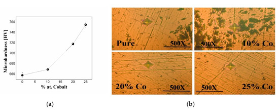 The mechanical properties of the studied samples depend mainly on the microstructure, which is determined by the composition, the fabrication process and sintering temperature [17]. We carried out a hardness evolution of the system Nd16Fe76−xCoxB8 with x = 0, 10, 20 and 25 as a function of the atomic percentage of cobalt. The microhardness values of the samples with respect to the cobalt content are displayed in Figure 8a. A general tendency of microhardness increasing with cobalt content is observed. The heat treatment promotes the diffusion of the cobalt atoms within the NdFeB matrix, increasing the grain size, which in turns reduces the lattice parameter and the porosity in the sample, resulting finally in the improvement of its hardness, as can be seen in the microhardness images presented in Figure 8b.