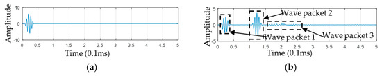 For the monitoring signal, the influence of the damage condition on the scattering wave is ultimately reflected in the waveform and superposition location. Generally, the larger the damage size is, the higher the energy of the scattering wave is; the longer the propagation path of the scattering wave is, the more energy the scattering wave consumes. Other factors, such as scattering angle and plate material, also affect the energy of scattering waves [27,28,29]. However, these factors will not change the center frequency of the scattering wave, and the scattering wave and the direct wave come from the same excitation source. Thus, the attenuation of the scattering wave energy can be approximately the attenuation of the wave amplitude. Therefore, the attenuation coefficient α of the scattering signal is simplified as the ratio of the amplitude of the scattering wave and the direct wave. In the damage signal model, the damage scattering wave is the product of direct wave and attenuation coefficient α. By changing α, the signal model can simulate the scattering waves with different energy.