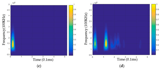 Lamb wave excited in the plate structure and the associated wavelet transform. (a) Excitation signal; (b) Plate structure response signal; (c) Time-frequency image of the wavelet transform of the excitation signal; (d) Time-frequency image of the wavelet transform of the plate structure response signal.