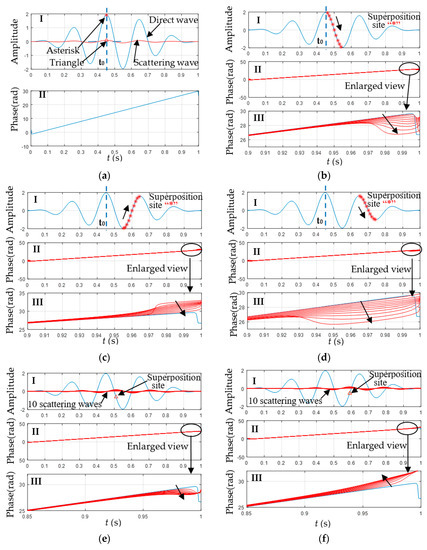 The experimental scheme constructed in this paper shows the effect of the scattering signal on the instantaneous phase of the signal. As shown in Figure 3b–d, the effect is manifested in two aspects: one is whether the instantaneous phase of the superimposed scattering signal is larger or smaller than the original instantaneous phase; the other is the degree of the instantaneous phase change after the superimposed scattering signal. As shown in Figure 3b, when the superposition site was between the maximum and the minimum, the instantaneous phase of the signal was smaller than the original instantaneous phase. As shown in Figure 3c, when the superposition site was between the minimum and the maximum, the instantaneous phase of the signal was larger than the original instantaneous phase. When the superposition site was again between the maximum and minimum, as shown in Figure 3d, the instantaneous phase was again smaller than the original instantaneous phase. When the superposition site was again between the minimum and the maximum, the instantaneous phase was again larger than the original instantaneous phase. From the description above, it can be concluded that whether the instantaneous phase becomes larger or smaller is absolutely determined by the extreme interval of the superposition location. The instantaneous phase distortion trend can be obtained from Figure 3b–d. When the scattering wave and the direct wave tended to be antiphase, the instantaneous phase deformation increased gradually; on the contrary, the deformation tended to slow down. The above experimental phenomenon would be repeated if the scattering wave continues to shift to the right. In Figure 3e,f, the effect of scattering wave attenuation on the instantaneous phase is illustrated. The experimental results show that the attenuation degree could not change the size relationship between the instantaneous phase after superimposing the scattering wave and the original instantaneous phase, but it mainly affected the time range of instantaneous phase deformation. When α was large, the range of the instantaneous phase deformation spreading along the time axis was also larger; on the contrary, the range along the time axis was smaller. Similar results could be obtained at the other superposition site. The following conclusions can be drawn from the analysis of the instantaneous phase change shown in Figure 3. When the superposition location was between the maximum and the minimum, the instantaneous phase of the monitoring signal model became larger than that of the direct wave. When the superposition location was between the minimum and the maximum, the instantaneous phase of the monitoring signal model became smaller than that of the direct wave. When the superposition site made the scattering wave and the direct wave tend to be antiphase, the instantaneous phase deformation of the monitoring signal model became larger. The attenuation degree of the scattering wave only affected the range of the instantaneous phase deformation on the time axis and did not change the size relationship.