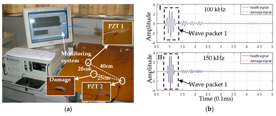 The experimental setup is presented in Figure 4a. The center distance between the actuator (PZT1) and sensor (PZT2) was 40 cm. The damage in the plate was a through-hole with a diameter of about 6 mm, which was approximately at a distance of 20 cm and 25 cm from PZT1 and PZT2, respectively. Equation (6) was used as the mathematical expression of the excitation signal (with a center frequency of 100 kHz and 150 kHz and five peaks). The actuator PZT1 was excited once, and the monitoring system collected the transmitted Lamb wave by sensor PZT2, performing the one-time signal data collection. To reduce the impact of random noise on results, each monitoring signal denoted the average value of 20 single successive received signals. To ensure the reliability of the analysis results, 10 monitoring signals were respectively collected under the condition of both plate health and damage. Using 10 signals was a strategy for experimental data analysis. The purpose was to observe whether the instantaneous parameter changes of the signal caused by the damage were ubiquitous in the signal and whether the difference of instantaneous parameters between the same state signals could conceal the instantaneous parameter changes of the signal caused by damage. The response of the plate structure under excitation by the signal with the center frequency of respectively 100 kHz and 150 kHz is presented in Figure 4b, wherein the solid line denotes the response when there was not any damage, and the dashed line denotes the response when there was damage. Following the analysis in Section 2.2, only the Lamb waves labeled as Wave packet 1 in Figure 4b were used to study the instantaneous phase and the marginal spectrum.