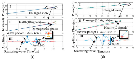 The instantaneous phase analysis is shown in Figure 4c,d with a center frequency of 100 kHz and 150 kHz, respectively. In Figure 4c,d, subfigure I presents the instantaneous phase of 10 monitoring signals after damage and 10 monitoring signals before damage; subfigure II denotes the locally enlarged view of subfigure I; subfigure III shows the information for the monitoring wave. As shown in Figure 4c,dII, the instantaneous phase of the 10 damage signals presented the same change concerning the instantaneous phase of 10 health signals, which indicates that the change was caused by a specific cause rather than a random signal. This change indicates that the monitoring signal was mixed with the scattering wave, and then it can be inferred that there was damage in the propagation path of the Lamb wave in a certain direction, which means that the plate structure was damaged. The damage diagnosis result obtained from the instantaneous phase change was consistent with the actual situation of the plate. According to Figure 4c,dIII, the direction and deformation of the instantaneous phase after damage could be obtained. In Figure 4cII, the instantaneous phase after the damage was smaller than the original instantaneous phase. According to the relationship between the superposition site and the direction of the instantaneous phase change obtained in Section 3.2, the superposition site of the scattering wave should be between the maximum and minimum of the direct wave. The real scattering wave and direct wave were used to verify this inference. In Figure 4cIII, the Wave packet of the direct wave is labeled “Wave packet 1”, and the damage scattering wave is labeled as “Scattering wave.” According to the definition of the superposition site in Section 3.2, the maximum point of the “Scattering wave” is marked as “*”, and the intersection point between the projection of this maximum “*” point on the abscissa, and the direct wave is the superposition site, which is marked as “∆”. The local magnification in Figure 4cIII shows that “∆” is indeed between the maximum and minimum of the direct wave. In Figure 4dIII, based on the same processing and analysis, the instantaneous phase after the damage is larger than the original phase, and the superposition position of scattering wave should be between the minimum and maximum. The local magnification in Figure 4dIII shows that “∆” is indeed between the minimum and maximum of the direct wave. The instantaneous phase analysis results of the two experiments are consistent with the relation between the instantaneous phase change direction and the scattering wave superposition summarized in Section 3.2. The instantaneous phases are shown in Figure 4(cII,dII), and their deformation degree is different from the original instantaneous phase shape. From the analysis of the instantaneous phase change in Section 3.2, when the superposition site makes the phase difference between the scattering wave and the direct wave tend to be in antiphase, the greater the deformation degree is, and vice versa. Compared with the superposition site in Figure 4dIII, the superposition site in Figure 4cIII made the scattering wave closer to the antiphase of the direct wave, and thus the local deformation of its instantaneous phase should be larger. Large deformation is beneficial for improving the recognition of instantaneous phase change. Moreover, the influence of scattering wave energy on the local deformation range of the instantaneous phase was discussed in Section 3.2. Although the scattering wave energy ratio (A1/A0 = 0.1) in Figure 4dIII is higher than that in Figure 4cIII (A1/A0 = 0.06), there is no significant difference between their instantaneous phase deformation ranges. It is considered that the damage scattering wave is the rescattering of the wave, and its energy is already very small; thus, its effect on the instantaneous phase change is limited. That is to say, in the case of the same or close energy, the effect of phase difference on the instantaneous phase change is higher than that of energy. This is also consistent with the conclusion that the superposition site of the scattering wave dominates the instantaneous phase change in Section 3.2.