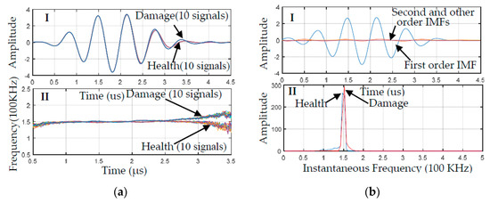 Instantaneous frequency and marginal spectrum of the Lamb wave packet with a center frequency of 150 kHz. (a) Sequence diagram and instantaneous frequency of the wave packet, and subfigure (I) shows the wave packet before and after damage; subfigure (II) shows the instantaneous frequency before and after damage. (b) The intrinsic mode function (IMF) and marginal spectrum of the wave packet. Subfigure (I) shows the IMFs after empirical mode decomposition (EMD) decomposition of the wave packet, and subfigure (II) shows the marginal spectrum of the wave packet before and after damage.
