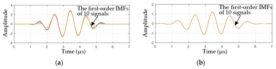 In the calculation of the marginal spectrum of the signal, the first step is to decompose the signal into multiple order IMFs by using the EMD. The EMD is an adaptive signal decomposition method based on the extreme signal points [20]. It is impossible to forecast the influence of minor changes in the extreme points on the IMFs, because the EMD process is complicated and includes interpolation, end-point processing, and IMF judgment. Namely, the signals are highly consistent from the sequence perspective, but they have randomly scattered extreme points, which may result in poor consistency in the IMFs obtained through the decomposition. The inconsistency degree can be so high that it can be impossible to analyze the marginal spectrum change of a signal before and after damage. Therefore, to guarantee the consistency in the IMFs acquired through the EMD process, the randomly scattered extreme points must be filtered out. Notably, in this study, the phase shift information of the instantaneous frequency of the signals that cannot be generated by a filter is analyzed, and thus the zero-phase filtering method must be used [31,32]. Besides, Wave packet 1 of the health sensing signal with a center frequency of 100 kHz, shown in Figure 4bI, is used as an example. The first-order IMFs obtained by the EMD before filtering out randomly scattered extreme points are presented in Figure 6a, wherein it can be seen that there was a poor consistency between the first-order IMFs of the ten same-condition signals. The first-order IMFs obtained by the EMD after filtering out randomly scattered extreme points are presented in Figure 6b, wherein it can be seen that the consistency between the IMFs of the ten same-condition signals could be achieved.