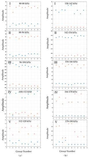 The frequency range around the two excitation frequencies is divided into five frequency bands and the marginal spectrum amplitude of the Lamb wave in each frequency band. “*” is the marginal spectrum amplitude before the plate damage, and “∆” is the marginal spectrum amplitude after the plate damage. Subfigures (I–V) relate to the five frequency bands. (a) The marginal spectrum of 100 kHz excited Lamb waves; (b) The marginal spectrum of 150 kHz excited Lamb waves.