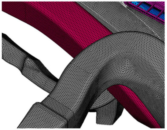 Figure 1 shows a 3D computational domain model of a truck cabin consisting of the truck cabin body, front windshield, side windshield, and defrosting duct. Defrosting area A represents the defrosting area in front of the driver, and defrosting area B represents the total defrosting area of the windshield. The inner surface of the windshield and defrosting duct were peeled off to form a closed computing area with the vehicle body. Figure 2 shows the geometric model of the defrosting duct. The simplified geometric model was also meshed to generate 2D and 3D volumetric meshes in the computational domain. Figure 3 shows the local meshes of the defrosting duct surface.