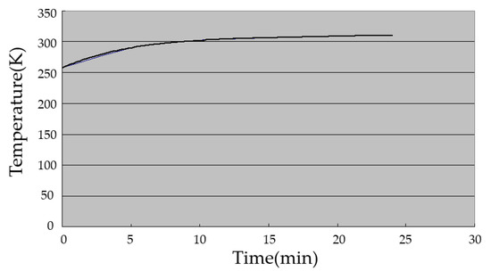 (1) Inlet boundary condition: the velocity inlet boundary condition (velocity-inlet) was used, and the inlet speed was determined according to the flow rate of the blown surface and the defroster duct inlet area. The inlet air temperature was introduced according to the Heating, Ventilating and Air Conditioning (HVAC) heating curve, as shown in Figure 4, and the initial temperature was 253 K. The HVAC heating curve was measured during the experiment.