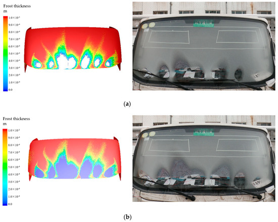 Qualitative comparison of the defrost effect between the numerical results and experimental data: (a) 15 min defrosting effect; (b) 20 min defrosting effect.