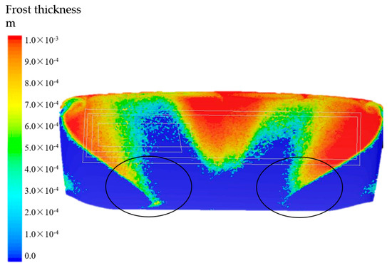 Figure 12 shows the frost thickness distribution on the windshields. By reducing the angle between the deflector and the horizontal outlet, and the position of the deflector, as shown in Figure 9, the defrosting flow could be more evenly distributed on the windshield, as shown in Table 2. Therefore, the defrosting performance was improved. It is obvious that defrosting efficiency increased. Comparing Figure 9 and Figure 12, the defrosting efficiency in the field of view of the white box in Figure 8 was about 89% after 25 min defrosting, while it was 99% in Figure 11. This indicates that the change of the outlet structure further improved defrosting efficiency. This provides engineers with useful information in the modification or design of the defrosting duct in the defrosting system for the medium-size Model N800 truck and similar vehicles.