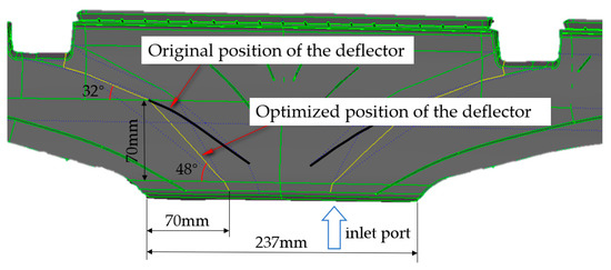 As discussed above, the poor defrosting performance was mainly due to the low air volume flow rate and air velocity at the outlet nozzle CL and CR. To improve this, the first step was to optimize the position of the guide plate in the defrost duct using the pressure loss reduction simulation. Figure 7 shows the geometry of the defrosting duct before and after optimization; in order to show the position change of the defrosting air duct deflector more clearly, Figure 7 is only a cross-sectional view of the central area of the defrosting air duct at the center thickness (outlet center center; CC), where the black line is the position of the guide plate before optimization, the yellow line is the position of guide plate after optimization, the green line is the edge line of the defrosting duct, and the blue line is the auxiliary line for modeling.