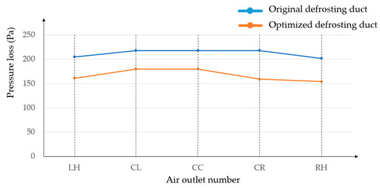 Figure 8 shows the pressure losses of the air flow in the defrosting duct before and after optimization. It shows that the pressure loss of the air flow at the outlets in the optimized defrosting duct was significantly lower than that in the original duct. The average reduction in pressure loss at each outlet nozzle was 21.56%. By comparing the positions of the guide plates in Figure 6, the optimized model could increase the air volume flow rate at the outlets, CL and CR, and hence increased the defrosting performance, as shown in Figure 8. The figure also indicates that the pressure loss at the five outlets was different, as the design was based on the minimum pressure loss method.