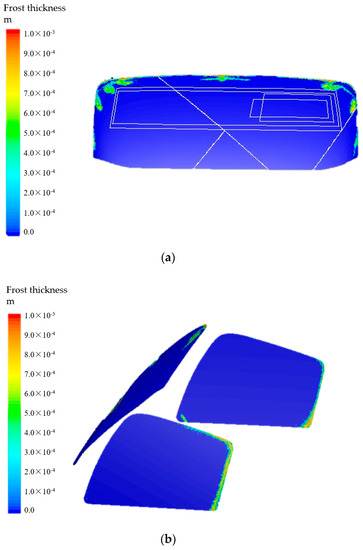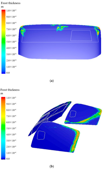 Frost thickness of windshield surface at 25 min after optimization. (a) Front windshield; (b) side windshield.