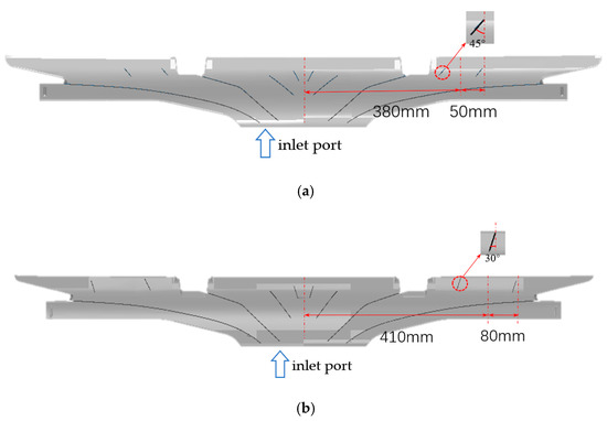 In addition to the optimization of the guide plate in the defrosting duct, Figure 10 shows the further improvement of the defrosting duct by optimizing the outlet structure, which was also based on pressure drop method simulation. By changing the outlet structure of the defrost duct, the injection angle of the jet flow could be changed, affecting the air distribution on the windshield. As shown in Figure 10a,b, the optimized model increased the horizontal angle between the duct and the windshield in the middle of the defrosting duct, and changed the angle and direction of the jet flow, to improve the airflow distribution on the windshield and hence improve the defrosting performance.