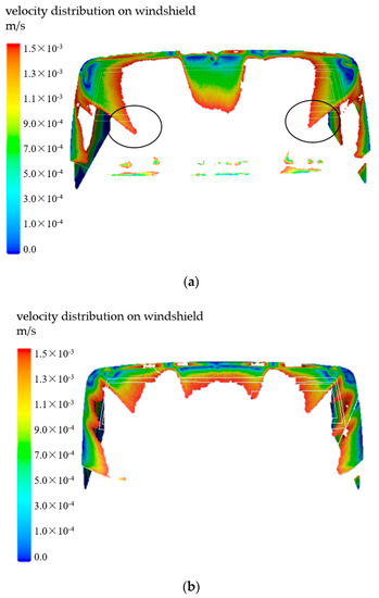 Velocity distribution on the windshield surface at 25 min: (a) Original model; (b) optimized model.