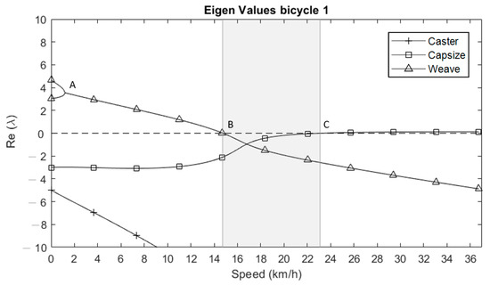 All bicycle configuration present similar graphs. Figure 7 addresses an example of the eigenvalues, namely from bicycle configuration 1. From 0 km/h till point A, four eigenvalues are found: two positive ones from the weave mode corresponding to a falling motion and two negative ones from the capsize and caster mode corresponding to a righting motion. The weave mode dominates and, without any rider corrections, the bicycle falls over as an unstabilized inverted pendulum. At point A, the two positive eigenvalues form a complex conjugate pair and the steering perturbation lead to an oscillatory weave motion. From point A until point B, the bicycle is less stable by the decreasing eigenvalue of the weave mode. From point B until point C, all the eigenvalues are negative and the corrective actions of the bicycle are large enough to prevent the bicycle from falling and small enough to not exhibit overcorrection. The bicycle is self-stable without any actions of the cyclist.