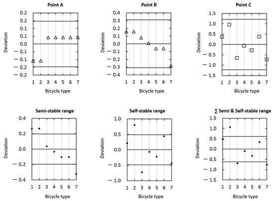 Figure 8 presents the deviation from the mean for every bicycle configuration for point A, B, C and for the semi-stable range, self-stable range, and the sum of both. The horizontal lines correspond to the mean and two times the standard deviation. When comparing the points, the highest difference is found for bicycle 7 in point B. However, no significant differences are found since all the values are within two times the standard deviation.
