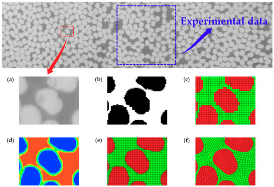 Procedure of generating FE model from a microscopic image of M55J/M18 composite: (a) original image, (b) binary image, (c) voxel mesh with image rescaling, (d) minimum SDF, (e) trimmed mesh, and (f) remeshing to quadrilateral elements.