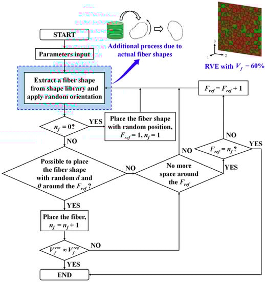 Many RVE samples were generated with various values of 60%, 55%, 45%, 35%, 25%, 15%, and 5% by randomly choosing the geometry of actual fibers from the particle-shape library created as described in the previous subsection. To arrange the fibers properly in a square domain, the RSE and RFR algorithms were employed with proper modification as described in the following subsection.